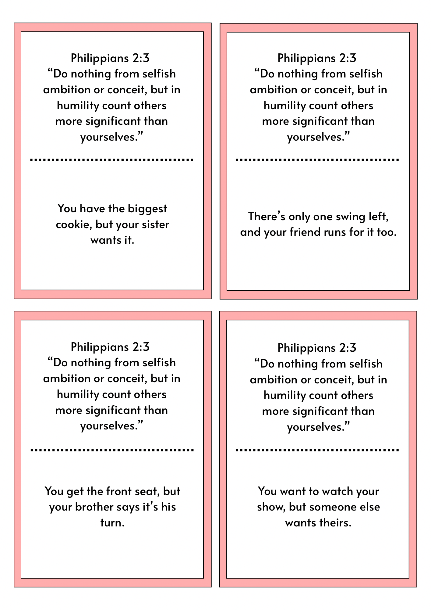 This printable Scripture memory kit helps your kids learn Philippians 2:3 — and live it out. With wall art, a parent guide, and interactive flashcards, you’ll teach them how to value others above themselves in everyday interactions.